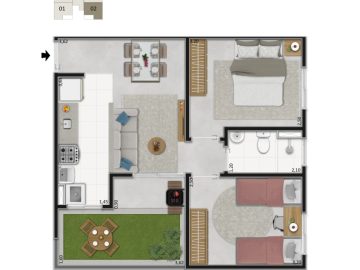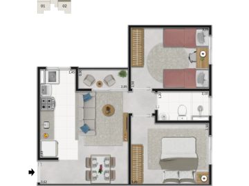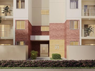 São apartamentos de 2 dormitórios, com varanda ou garden privativo, banheiro revestido até o teto, preparo para ar-condicionado no quarto de casal, tomada USB na sala e acabamento de qualidade.