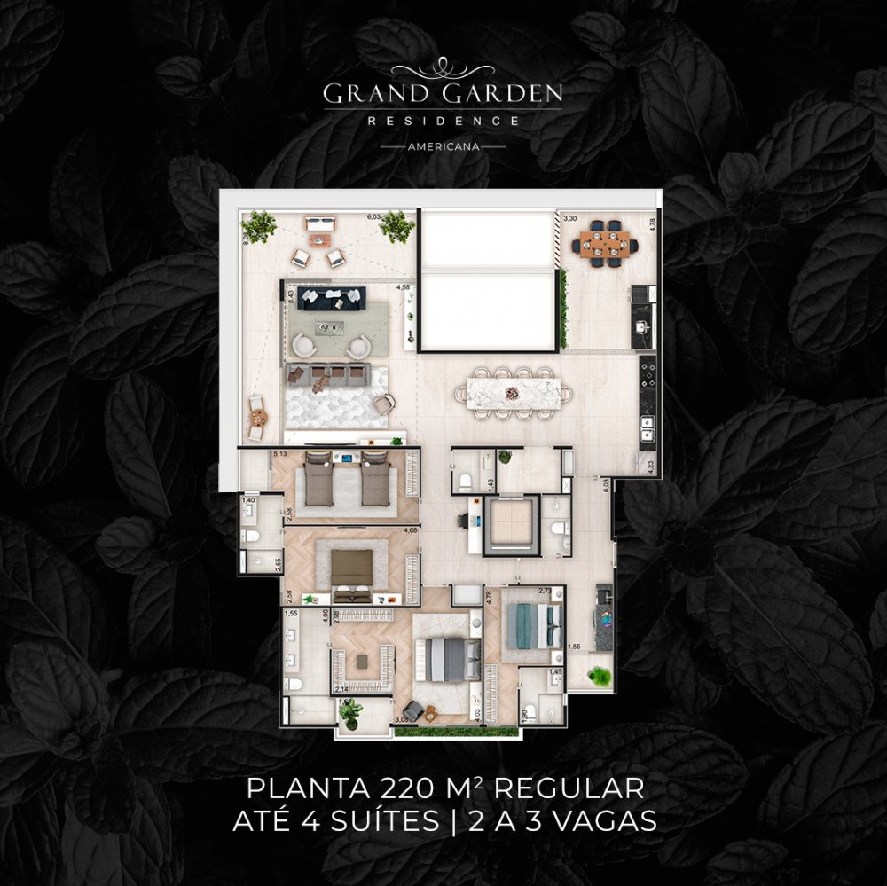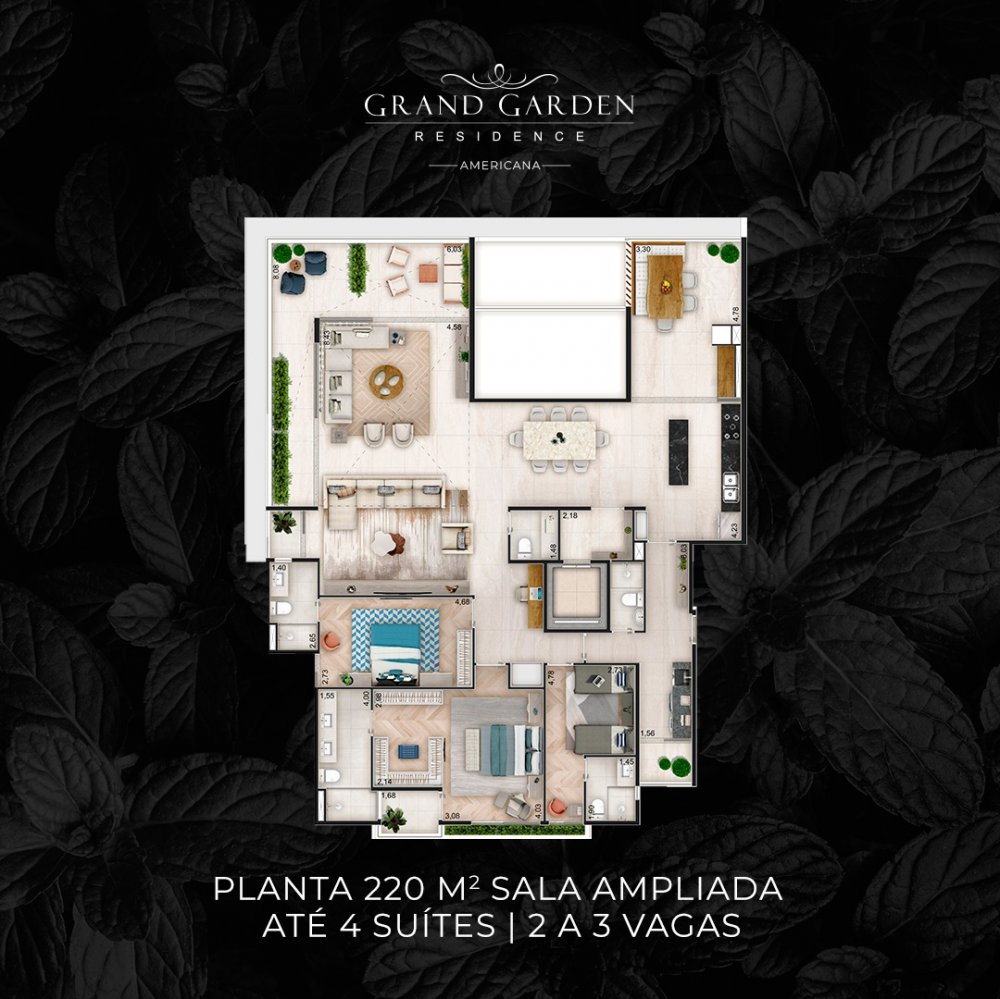 - Apartamentos de 190m² a 220m² e cobertura Penthouse de 420m²